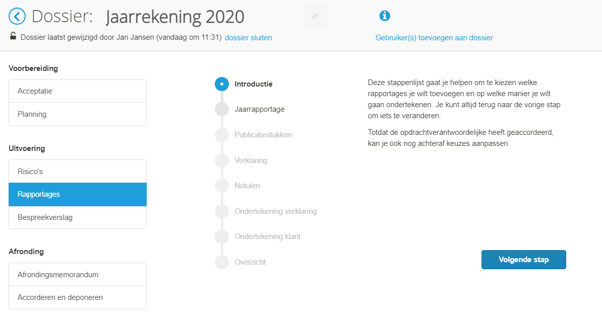 Met behulp van een stappenlijst kan voor het dossier ingesteld worden welke rapportages toegevoegd moeten worden.